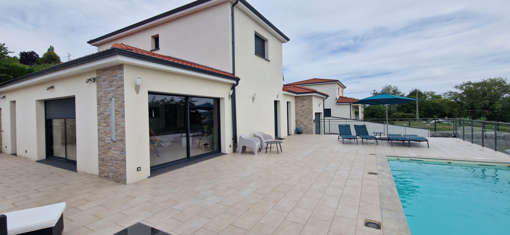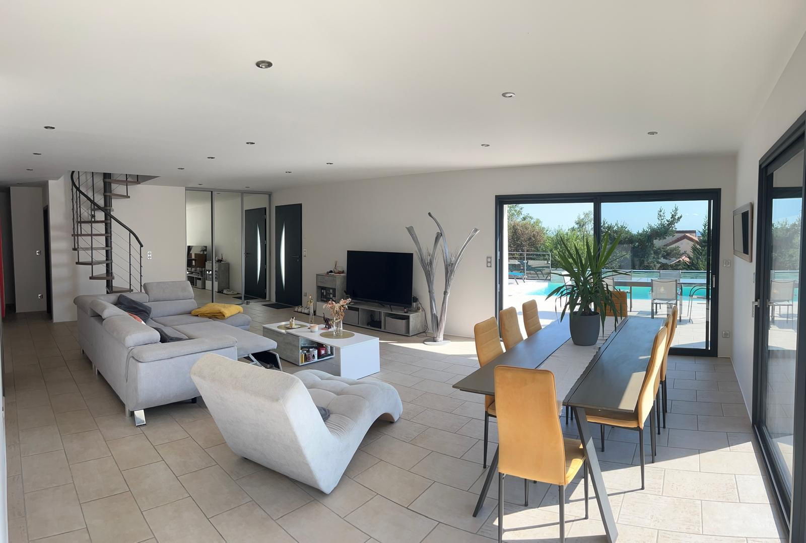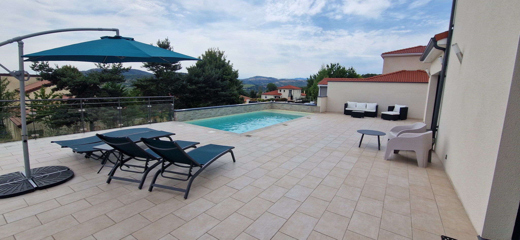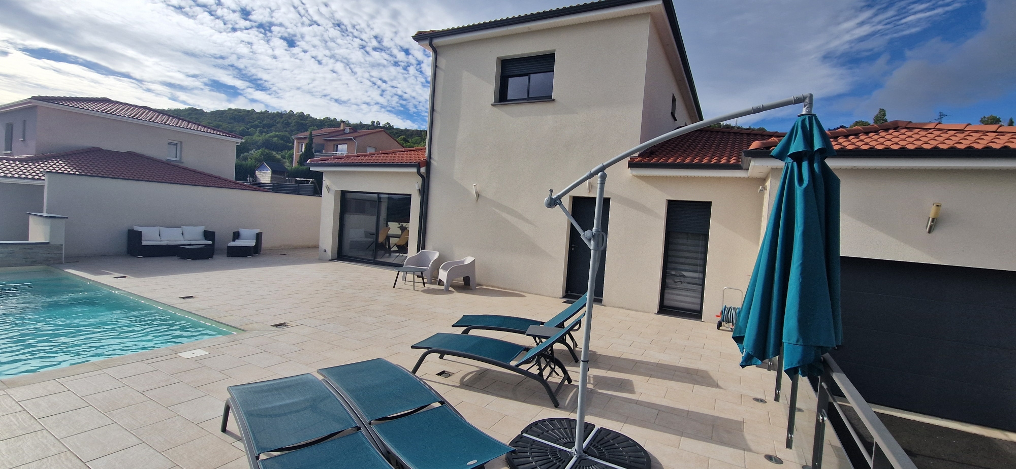 Au sud de Clermont-Fd sur la commune du Crest – Maison individuelle contemporaine (construction 2019) – 160 m2 – En rez de chaussée vous trouverez une pièce de vie de plus de 65m2 avec cuisine ouverte entièrement équipée en accès direct sur la terrasse (100m2) – 2 chambres – 1 salle d’eau – 1 WC – 1 espace lingerie-dressing – 1 buanderie et un garage de 17m2. A l’étage 2 chambres – salle de bains – WC. Piscine chauffée avec volet roulant motorisé et bâche d’hiver – Chauffage au sol avec pompe à chaleur air/eau avec option rafraichisseur – Fenêtres alu avec domotique SOMFY.