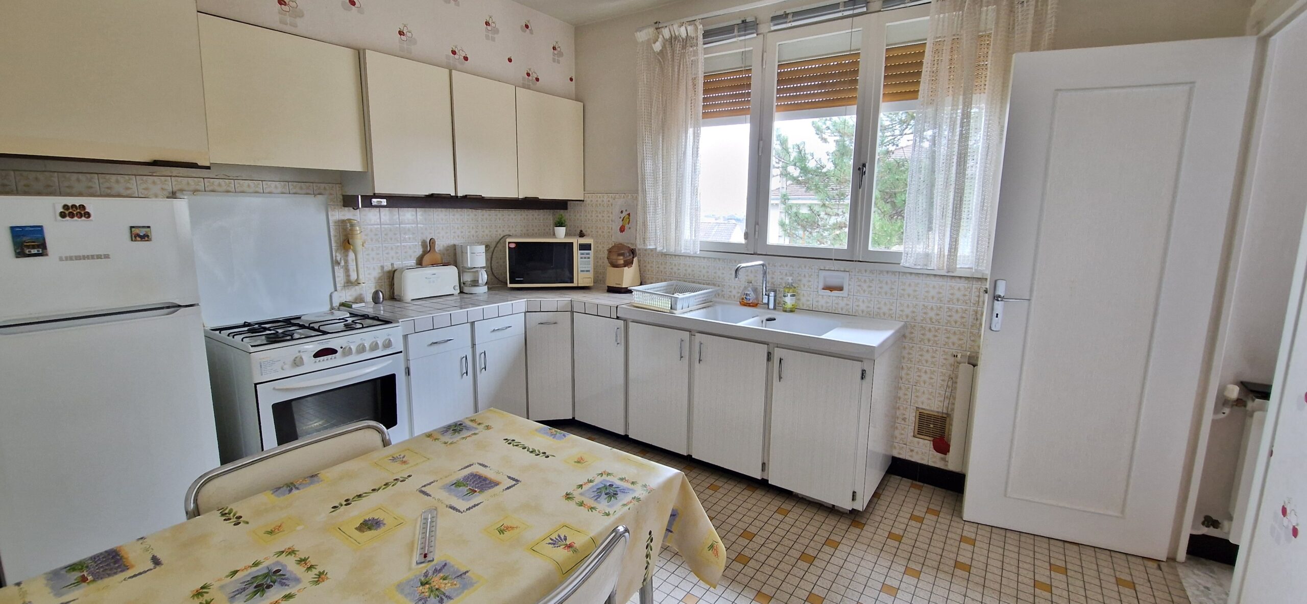 Maison de construction traditionnelle très lumineuse (1970) implantée sur une parcelle de quasiment 800m² – A l’étage vous trouverez un séjour double qui donne sur le balcon et la cuisine – 3 chambres – 1 salle d’eau et 1 WC séparé. Au rez de chaussée : l’entrée avec placard – 1 chambre – 1 WC – 1 garage avec porte motorisée – 1 espace chaufferie/buanderie et 1 cave. Chaudière gaz de ville. Au delà des travaux de rénovation pour faire ressortir le beau potentiel de ce bien, il faudra prévoir un raccordement au tout à l’égout de la commune.