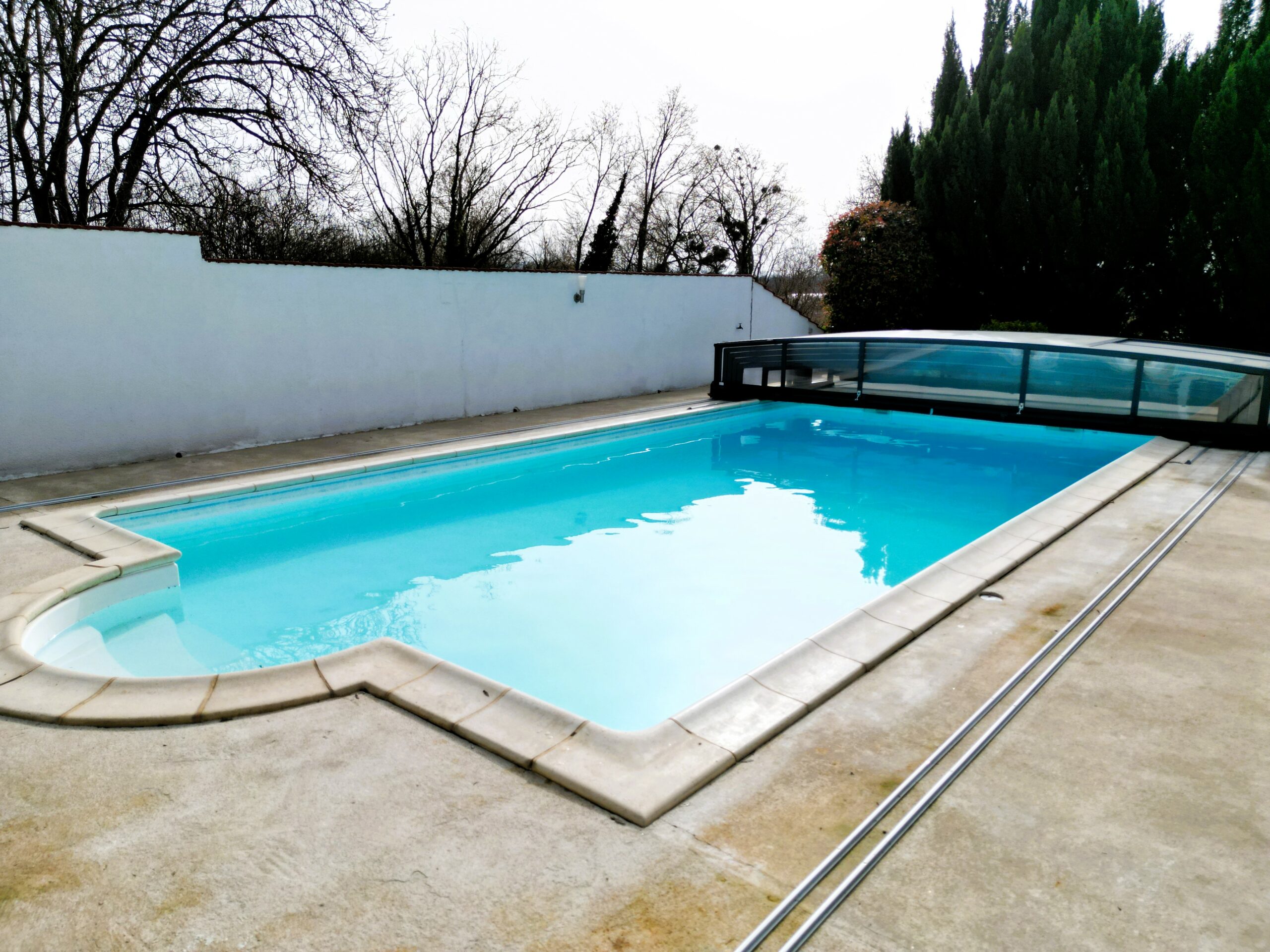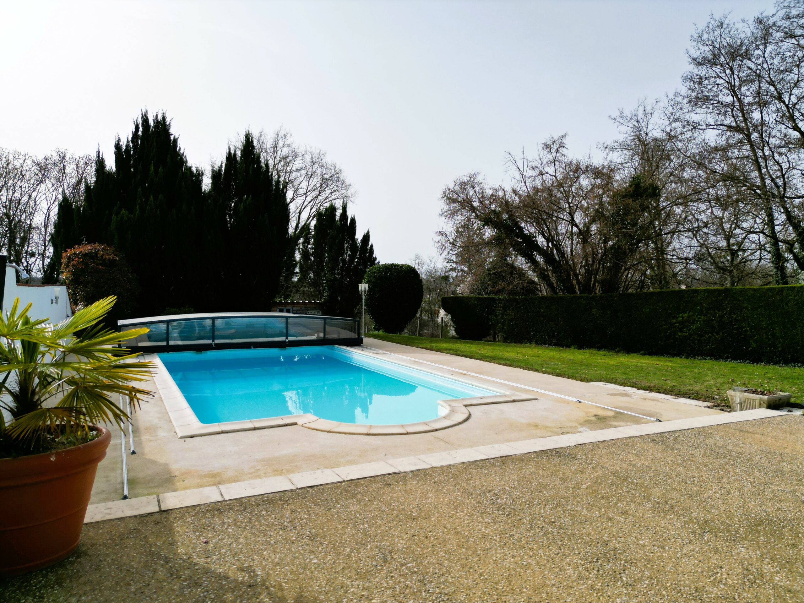 Garage, cave, grand hangar pour stockage ou activité professionnelle, et piscine couverte avec dôme électrique.